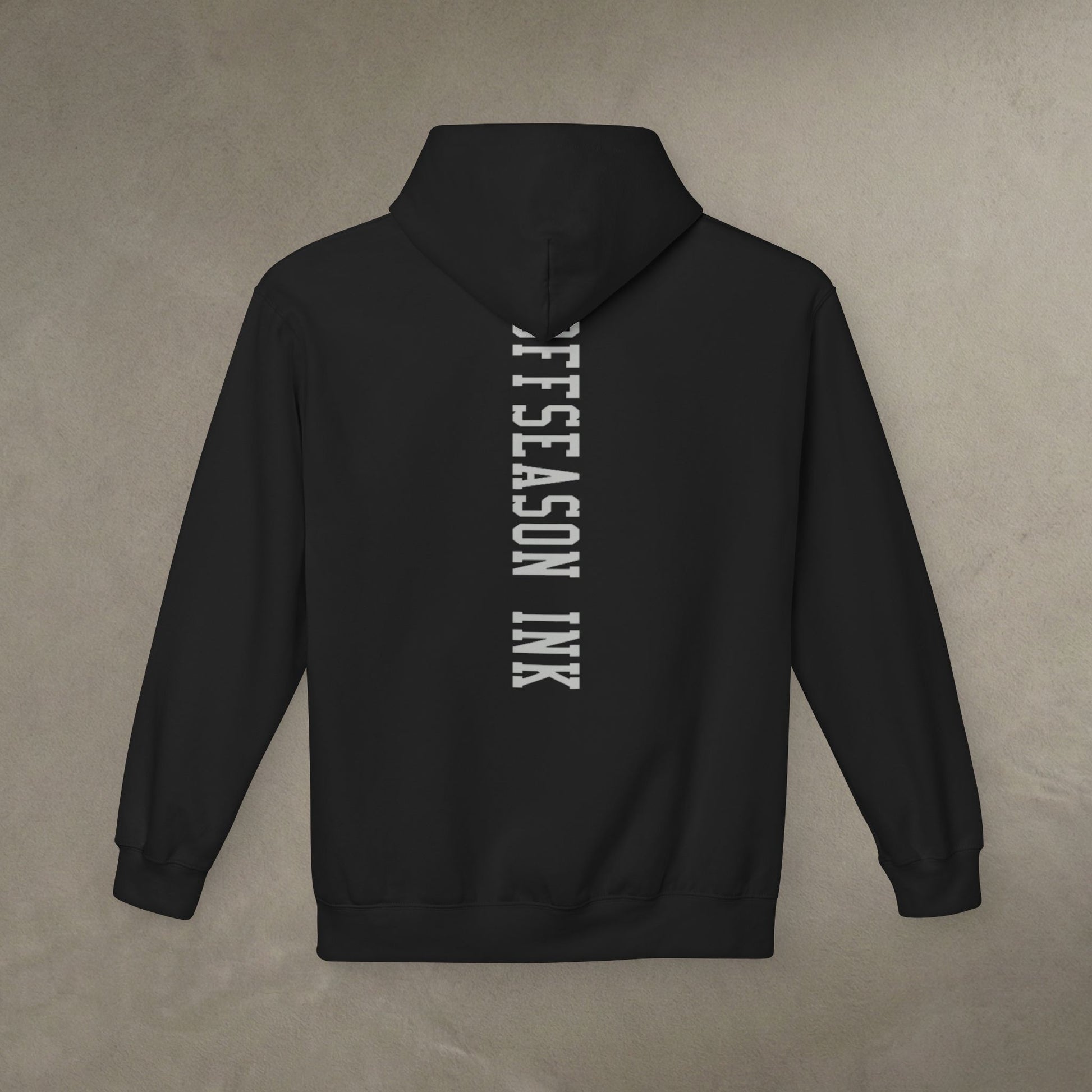 "Watch your back. This premium hoodie features our signature 'Vertical Spine' typography running down the center back—symbolizing the backbone of consistency required to win. The front carries a subtle, minimalist 'OffSeason Ink' wordmark on the chest for a clean, disciplined look. Engineered from heavyweight structured fleece that holds its shape through every rep and recovery. Step into the movement."